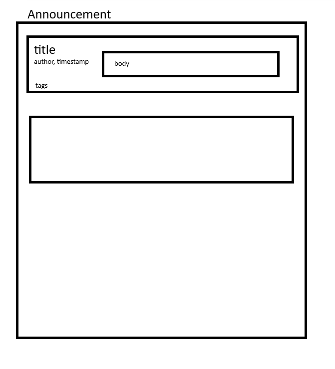 - For a announcement, I’m going to need an ID (standard in every database), author, title, body, time, and tags data